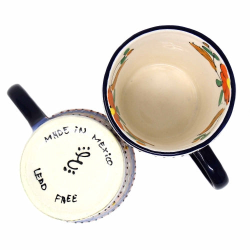 These richly-colored mugs are handcrafted and painted by Mexican artisans. The outside, inside, and handle are covered with a textured pattern making each piece unique and very functional. 4 inches tall; holds 10 ounces of liquid each. Lead-free, dishwasher and microwave safe.