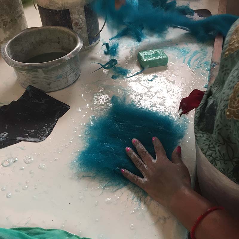 The first step to creating these beautiful felt pieces begins with gathering some of the world’s finest sheep’s wool from New Zealand. Making felted wool is an ages-old, time-consuming process of bonding fabric with fiber. This is a physical job where the artisan’s scrub, rub, roll and rinse the wool again and again with soapy water.